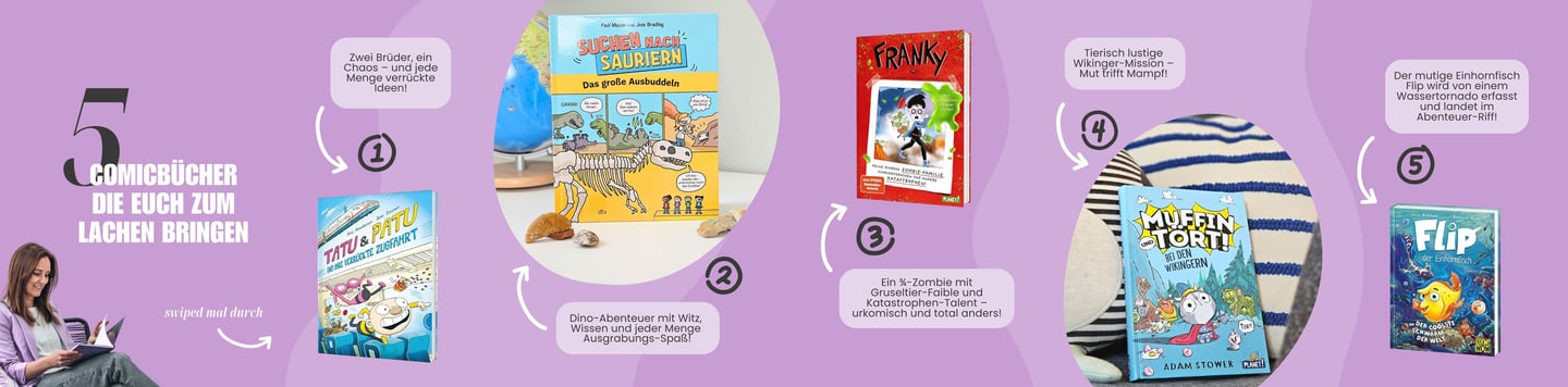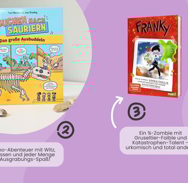 Lachen verbindet – und genau das schaffen diese fünf Comicbücher mit Leichtigkeit. Sie sind frech, fantasievoll und voller verrückter Ideen, die Kinder ab ca. 6 Jahren begeistern. Ob Dino-Ausgrabung, Wikinger-Mission oder ein halber Zombie mit Gruseltiere-Faible – hier wird nicht nur gelesen, sondern mitgefiebert und mitgelacht.