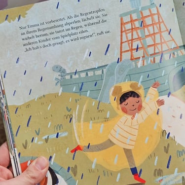 Handlung: Emma liebt ihren gelben Regenumhang – und bleibt sich treu, auch wenn andere zweifeln. Als der Regen kommt, ist sie bereit und tanzt durch die Tropfen.